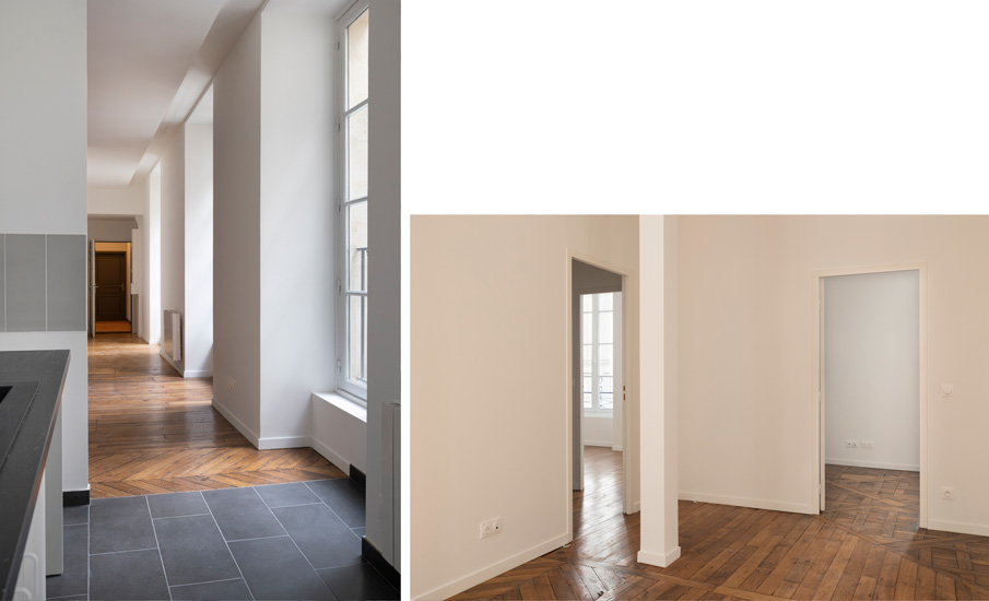 Au 5ème et 6ème étage du bâtiment sur rue, 2 logements contiguës non rénovés en 2007, ont fait l’objet d’une réorganisation totale pour créer 2 duplex similaires avec une terrasse très spacieuse.