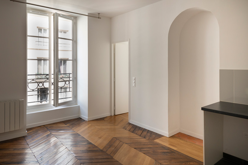 Au 5ème et 6ème étage du bâtiment sur rue, 2 logements contiguës non rénovés en 2007, ont fait l’objet d’une réorganisation totale pour créer 2 duplex similaires avec une terrasse très spacieuse.