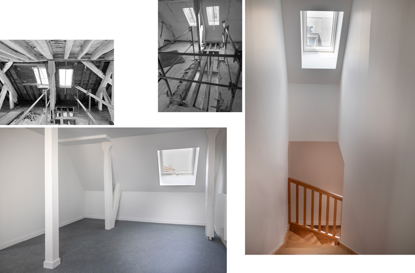 La pose d’un isolant étant prévue pour tous les logements vides, c’est l’occasion d’intervenir sur la couverture située au-dessus du T3 situé du 3ème étage du bâtiment B. Pour récupérer le volume des combles, le plancher des combles est supprimé, l’isolant sera posé sous les rampants, des châssis de toits seront poser pour apporter lumière naturelle et ventilation naturelle en été.